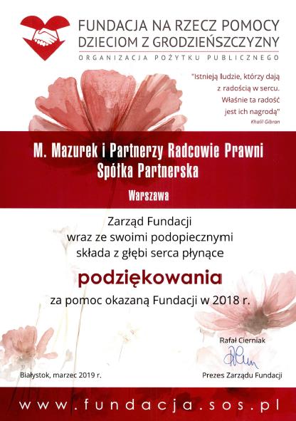 Kancelaria M.Mazurek i Partnerzy otrzymała podziękowania od fundacji na Rzecz Pomocy Dzieciom z Grodzieńszczyzny za pomoc okazaną w 2018 r.